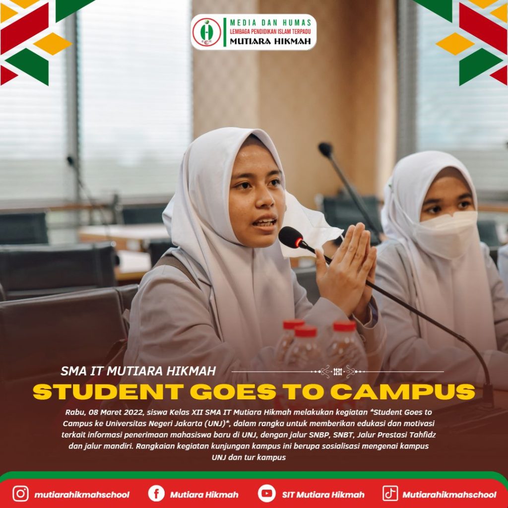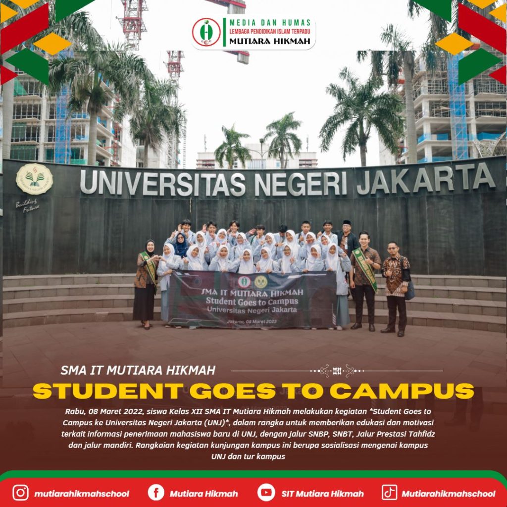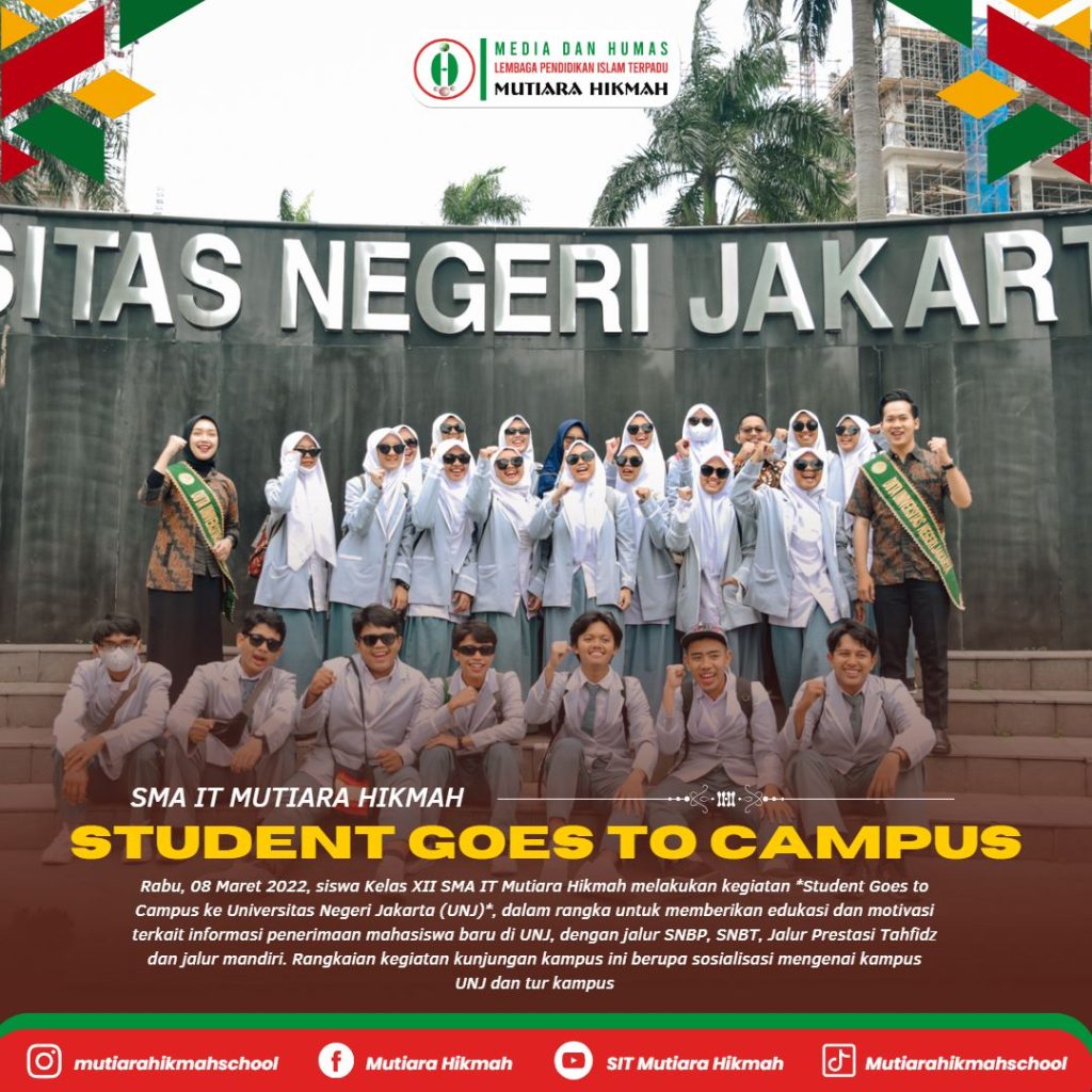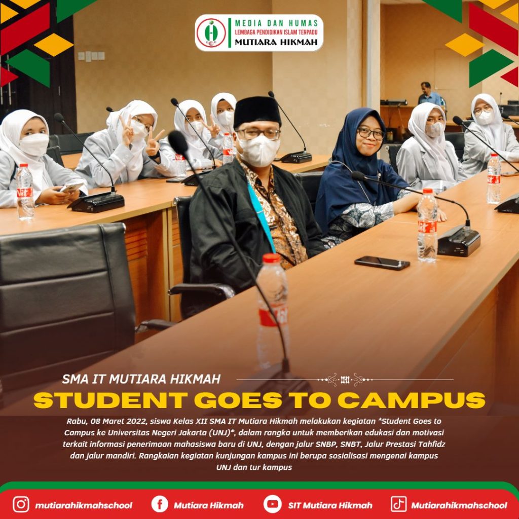 Salah satu program persiapan masuk Perguruan Tinggi Negeri (PTN) yang dilaksanakan di SMA IT Mutiara Hikmah adalah kegiatan Student Goes to Campus. Pada kesempatan kali ini siswa Kelas XII SMA IT Mutiara Hikmah melaksanakan kunjungan kampus ke Universitas Negeri Jakarta (UNJ) pada Rabu, 08 Maret 2023. Kegiatan ini bertujuan untuk memberikan edukasi tentang penerimaan mahasiswa baru di UNJ serta meningkatkan motivasi siswa untuk melanjutkan pendidikan ke jenjang yang lebih tinggi.