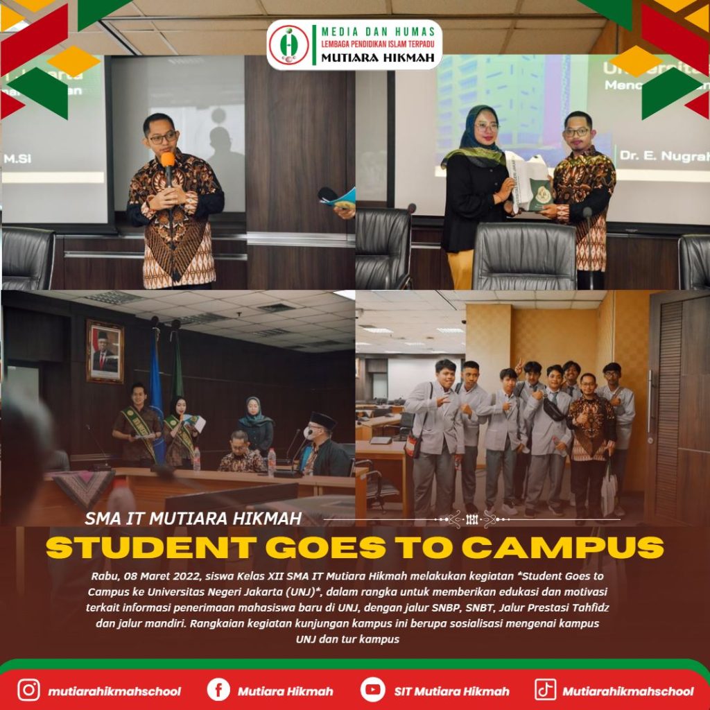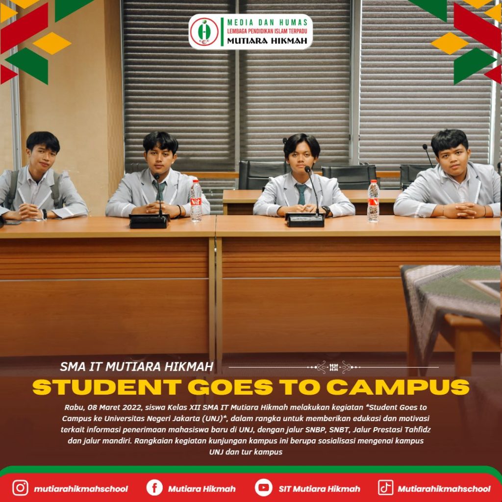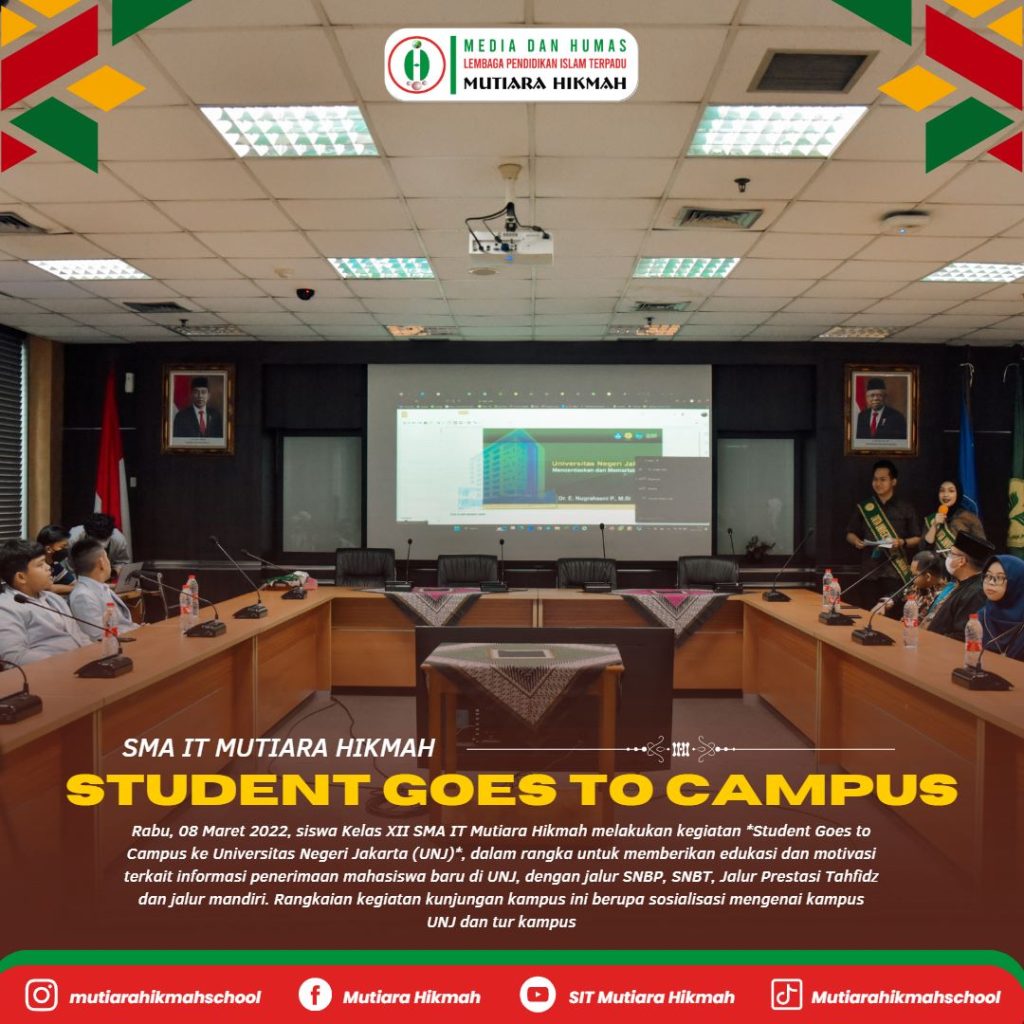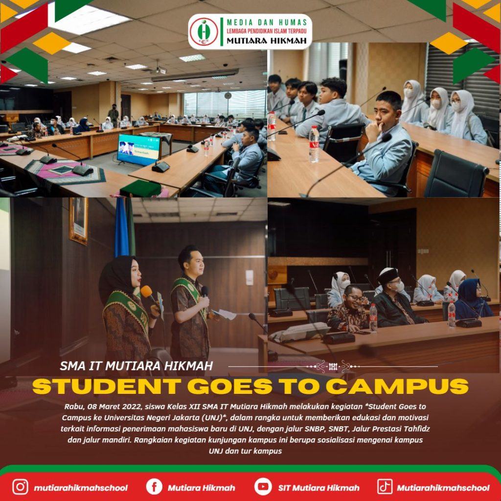 Salah satu program persiapan masuk Perguruan Tinggi Negeri (PTN) yang dilaksanakan di SMA IT Mutiara Hikmah adalah kegiatan Student Goes to Campus. Pada kesempatan kali ini siswa Kelas XII SMA IT Mutiara Hikmah melaksanakan kunjungan kampus ke Universitas Negeri Jakarta (UNJ) pada Rabu, 08 Maret 2023. Kegiatan ini bertujuan untuk memberikan edukasi tentang penerimaan mahasiswa baru di UNJ serta meningkatkan motivasi siswa untuk melanjutkan pendidikan ke jenjang yang lebih tinggi.